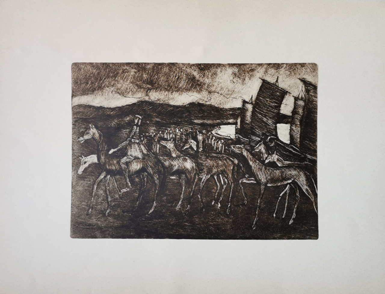 - NOTIZIE STORICO CRITICHE La stampa rappresenta la donazione dei cavalli di Norace, antico eroe della mitologia sarda a cui si attribuisce la fondazione della città di Nora. Lungi dall’essere una rappresentazione serena la puntasecca rispecchia lo stile “a tinte fosche” di Valerio Pisano che ricorda le atmosfere delle incisioni di Goya e Ensor (BIBH: BS255020)