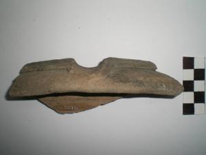 Frammento di orlo di mortaio di grandi dimensioni. Presente il beccuccio per versare i prodotti ottenuti dalla macinazione