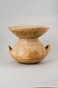 Labbro ad imbuto, corpo globulare, piede a disco. Due anse a bastoncello impostate orizzontalmente sul corpo sono alternate a due protomi semplificate a forma di paletta.