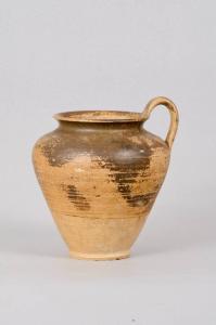 Corpo ceramico beige, vernice bruno.\nLabbro estroflesso, bocca rotonda, breve spalla obliqua, corpo piriforme, piede a disco. Ansa a nastro impostata verticalmente sull'orlo e sulla spalla.