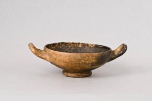Corpo ceramico nocciola; ingobbio rosato, vernice olivastra diluita, opaca.\nOrlo indistinto, vasca abbastanza profonda con profilo obliquo, piede ad anello ombelicato (linea nera all'interno e ombelico nero). Anse a bastoncello impostate orizzontalmente, rivolte verso l'alto.