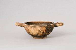 Corpo ceramico nocciola; ingobbio rossiccio; vernice nera, olivastra, diluita poco lucente.\nVasca profonda a profilo concavo con pareti arrotondate, piede ad anello cavo. Anse a bastoncello impostate orizzontalmente sull'orlo. Sulla parte bassa della vasca, esternamente linee concentriche a risparmio.