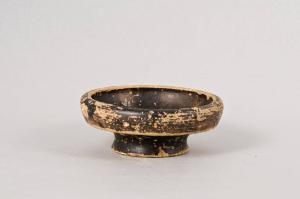 Corpo ceramico beige; vernice nera diluita, lucente.\nOrlo estroflesso arrotondato, corpo troncoconico, alto piede, fondo interno della coppa ombelicato.