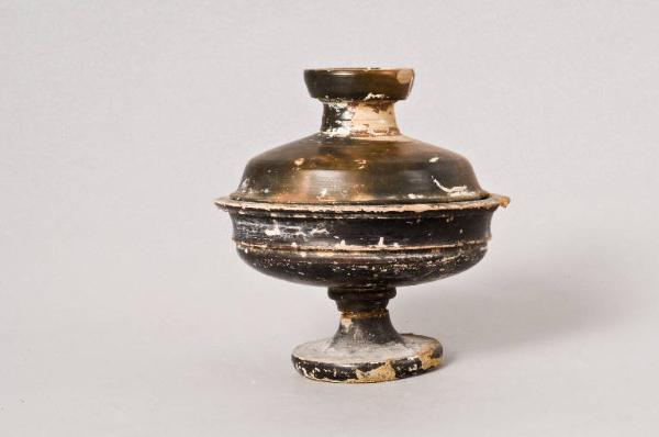 Corpo ceramico nocciola, vernice nera coppa, olivastra, poco diluita.\nCoppa: orlo verticale, rientrante, vasca poco profonda ed espansa, carenata; alto troncoconico svasato all'estremità.\nCoperchio: orlo estroflesso con carenatura, ampia vasca. Modanatura all'attacco della presa campanulata.