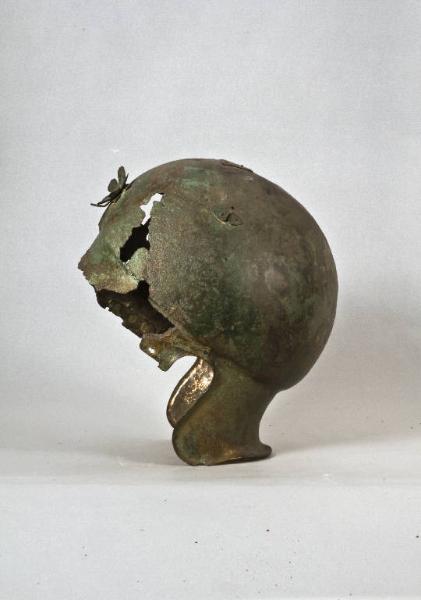 Calotta di forma subogivale, depressione frontale indicata a sbalzo, paranuca con estremità inferiore ripiegata e arrotondato lungo i lati a seguire il profilo delle orecchie libere. Si conservano gli attacchi delle paragnatidi, di cui uno a cerniera: sopra le orecchie due placchette, sulla calotta plachetta e dispositivo per applicare le penne. Sulla fronte è applicata rosetta a sei petali in lamina, fissata con un ribattino