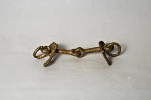 Morso con montanti semilunati.\nFiletto snodato a sezione circolare con estremità ad anello, montanti in forma arcuata a traforo, campanello ad anello liscio.