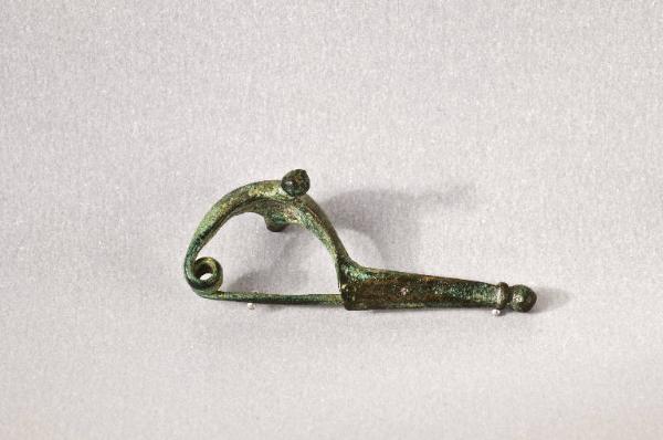 Lamina a nastro profilata da forellini. L'estremità maschio presenta placche di chiusura cuoriformi a punta lobata, decorate con incisioni; l'estremità femmina presenta quattro fori d'aggancio rafforzati da lamina sovrapposta conformata a foglie lanceolate.