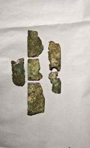 Lamina a nastro con bordi decorati da elementi sbalzati a rilievo e in successione; presenta ribattini distanziati.