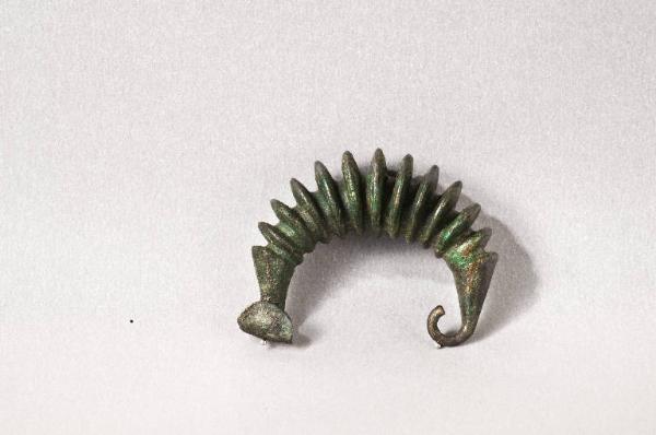 Fibula a grandi coste con arco massiccio; molla di forma troncoconica, staffa a sezione pentagonale decorata da linee oblique incise.