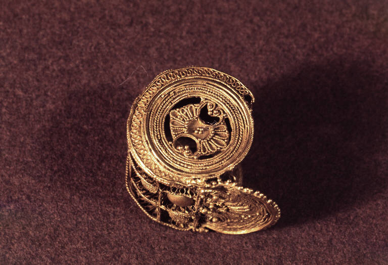 Orecchino a forma cilindrica con estremità a lamina semicircolare orlata e riempita a granulazione e decorata con un motivo a palmetta con volute ai lati, realizzata a filigrana. Il corpo cilindrico è cassettonato a quadrati disposti su tre file e orlati da doppio cordonciono aureo; al centro di ogni quadrato vi è mezza sfera liscia alternata ad una sfera coperta da puliviscolo.