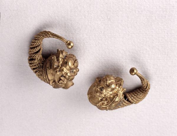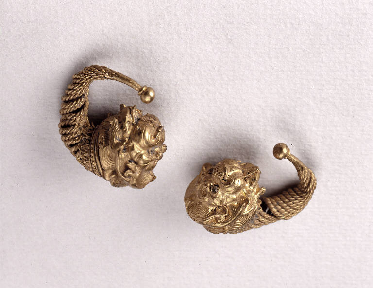 Arco costituito da fili godronati avvolti a spirale su un fusto in lamina liscia che si assottiglia ad una estremità; sull'altra estremità protome leonina con criniera a ciocche striate, collegata all'arco da un filo liscio tra due godronati e un collarino di petali in filigrana.