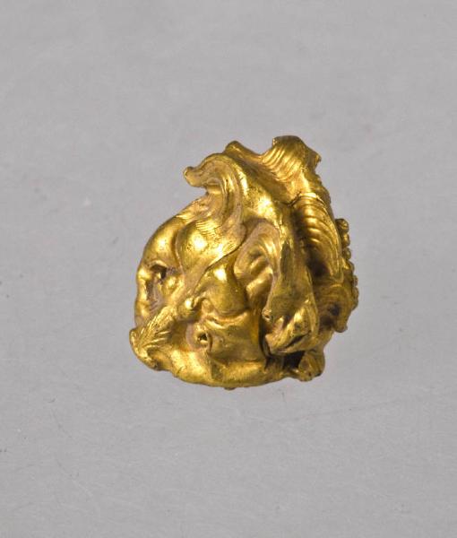 Protome leonina realizzata a sbalzo: muso indicato, criniera con ciocche distinte.
