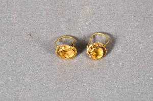 Orecchini con castoni rotondi privi della pietra, circondati da un motivo di palmette accostate. Ardiglione ad arco.