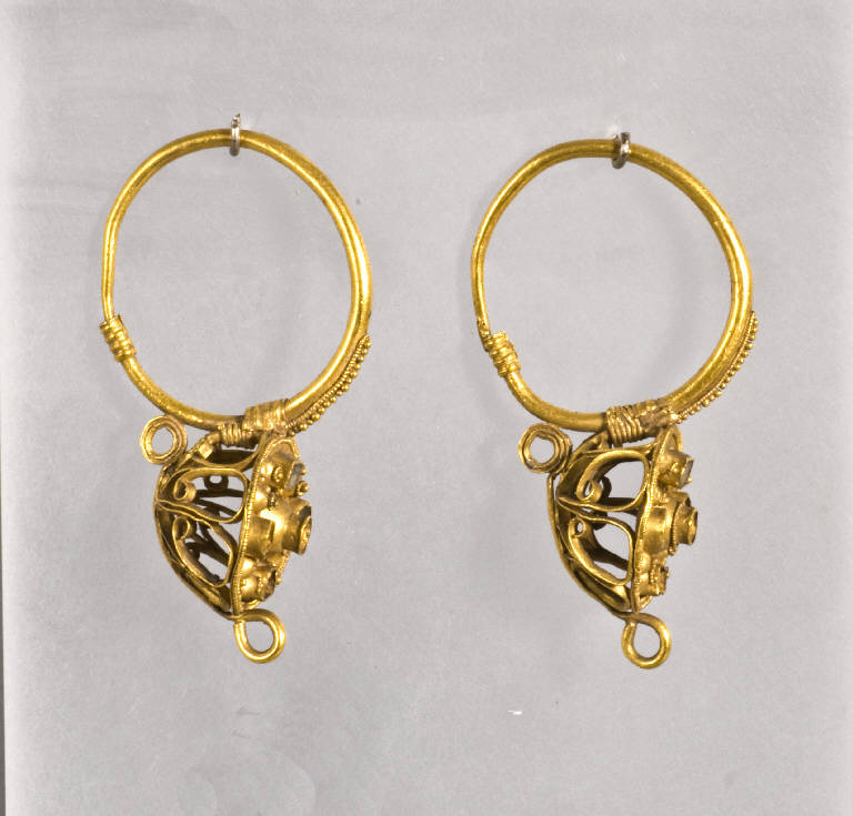 Orecchini a cestello.\nAd un anello è saldato un elemento decorativo fatto di volute di filigrana a giorno e chiuso da un disco nella parte anteriore che conserva quattro castoni disposti a cerchio intorno al castone centrale.