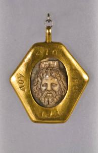 Cammeo di forma ovale intagliata a forte rilievo. Il cammeo è montato in una palcca d'oro di forma esagonale del XIX secolo d.C. che l'iscrizione: DIO - CKO - YPI - DOY.