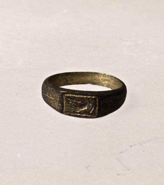 Anello con verga larga a nastro e piastra centrale di forma rettangolare intagliata in negativo.