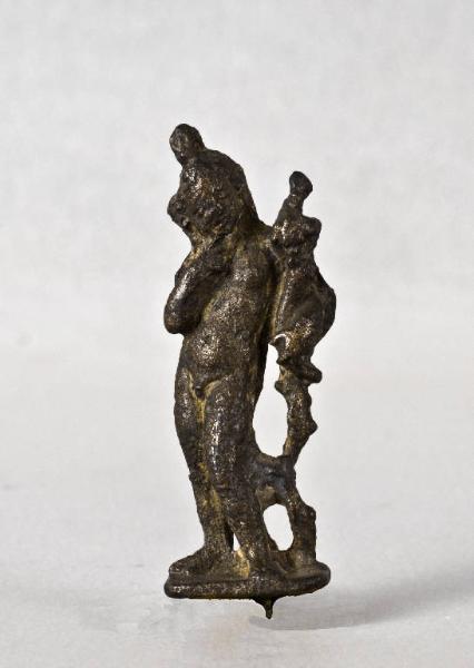 Arpocrate stante con cornucopia. La gamba destra è tesa, mentre la sinistra piegata è leggermente arretrata; porta un'armilla sul braccio destro.\nIl paffuto fanciullo è raffiguarto nel tipico atto di appogiare l'indice destro alla bocca, mentre con la sinistra regge una cornucopia. Porta dietro alle spalle una faretra; i capelli sono raccolti in una treccia e il capo è cinto dalla doppia corona con crescente lunare e disco solare.\nSotto il piede destro foro per fissaggio.