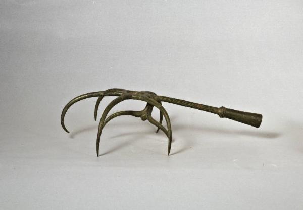 Strumento a cinque punte ricurve, assotigliate verso l'estremità, saldate ad un anello appiattito. Impugnatura a sezione circolare decorata a cordone ritorto terminante in una parte conica cava, ornata da un anello.