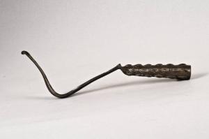 Impugantura troncoconica decorata con noduli stilizzati a imitazione di una clava; cucchiaio a forma di L con superficie concava che si restringe verso l'estremità.