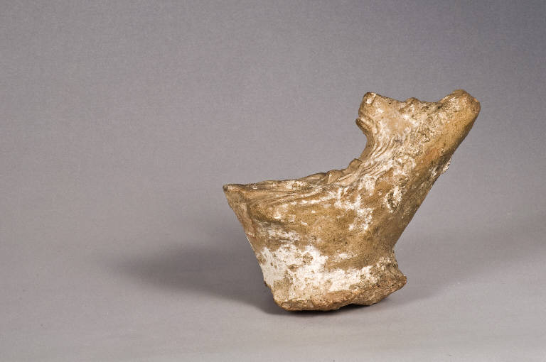 Argilla rosa, ingobbiatura crema \nProtome di cane: ha muso allungato, occhi indicati, orecchie tese a punta. Ben indicati i ciuffi del pelo; è dotato di collare tintinnabulum. Tra le zampe anteriori, foro di scolo.