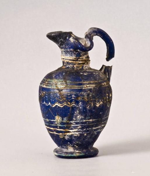 Vetro pressato su nucleo friabile di colore blu.\nLabbro trilobato, collo cilindrico, corpo ovoidale, piede ad anello. Ansa a bastoncello impostata sul labbro e sul corpo.