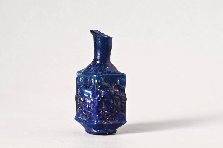 Vetro di colore blu\nOrlo ingrossato sbilenco, labbro espanso, collo cilindrico con strozzatura alla base, spalle oblique, corpo a sezione romboidale con costolatura all'estremità superiore e inferiore, piede ad anello.