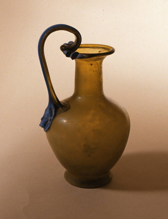 Vetro di colore giallo con striature e bolle d'aria; applique in vetro azzurro opaco.\nOrlo espanso arrotondato, collo cilindrico, breve spalla arrotondata, corpo piriforme, piede troncoconico. Ansa curva a trilpice costolatura sopraelevata, impostata sull'orlo e sulla spalla: all'attacco testina femminile frontale con bocca semiaperta. Sull'orlo ai lati dell'ansa, pizzicature.