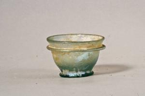 Vetro di colore verde-azzurro chiaro, con bolle d'aria.\nOrlo arrotondato sotto il quale cordoncino a rilievo da stessa parete ripiegata, vasca troncoconica, piede ad anello.