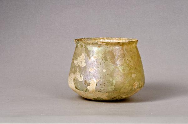 Vetro di colore verde chiaro con bolle d'aria.\nOrlo espanso, tagliato a spigolo vivo, vasca troncoconica rastremata verso l'alto. Fondo convesso con al centro cavità.