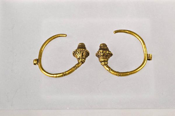 Orecchini ad anello terminante con elemento decorativo costituito da due elementi campaniformi uniti da un giro di perle in successione.