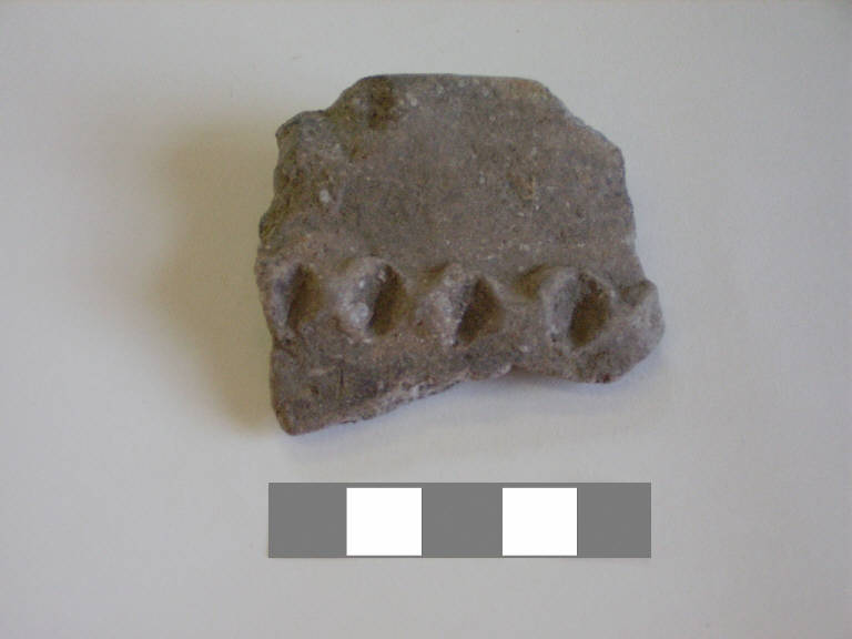 Orlo+ parete di olla\nSi conserva un frammento di orlo ingrossato, con bordo appiattito inclinato verso l'interno e parte del corpo cilindrico. Reca un cordone a tacche.\nCorpo ceramico grossolano, a superficie esterna e interna grezza.\nColore nucleo: grigio, superficie esterna e interna: bruno chiaro.