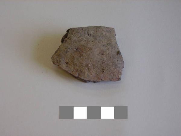 Orlo+ parete di scodella\nSi conserva un frammento di orlo distinto con bordo arrotondato e vasca a calotta\nCorpo ceramico semi grossolano, a superficie esterna e interna lisciata sommariamente.\nColore nucleo: grigio, esterno: bruno chiaro, interno: bruno rossiccio