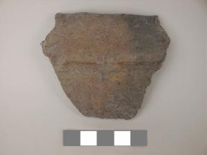 Orlo+ parete di scodellone\nSi conserva un frammento di orlo distinto con bordo arrotondato e parete. Reca un cordone a tacche.\nCorpo ceramico semi grossolano, a superficie esterna lisciata sommariamente, interna con tracce di lisciatura\nColore nucleo: grigio, esterno: bruno, interno: bruno.