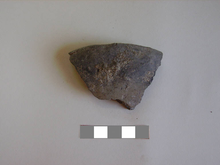 Orlo+ parete di scodella\nSi conserva un frammento di orlo indistinto con bordo arrotondato e parete.\nCorpo ceramico molto grossolano, a superficie esterna lisciata sommariamente, interna grezza.\nColore nucleo: grigio scuro, esterno e interno: grigio.