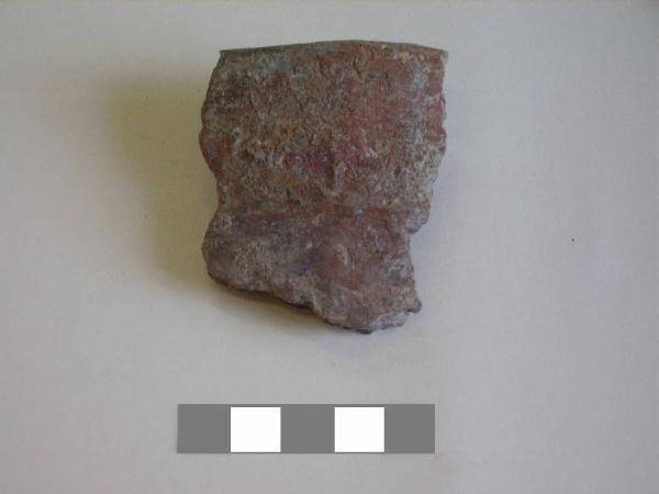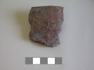 Orlo+ parete di scodellone\nSi conserva un frammento di orlo svasato con bordo arrotondato e parete.\nCorpo ceramico grossolano, a superficie esterna con tracce di lisciatura, interna lisciata sommariamente.\nColore nucleo: grigio, esterno e interno: bruno.