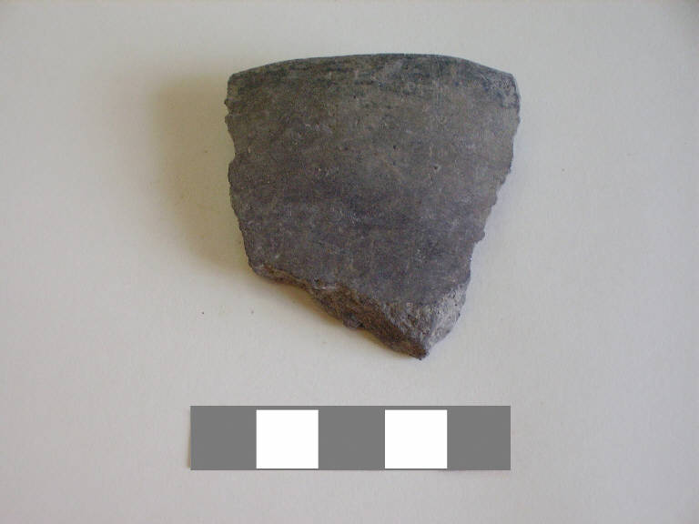 Orlo+ parete di scodella\nSi conserva un frammento di orlo indistinto con bordo arrotondato e parete.\nCorpo ceramico grossolano, a superficie esterna e interna lisciata\nColore nucleo: bruno, esterno e interno: grigio