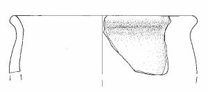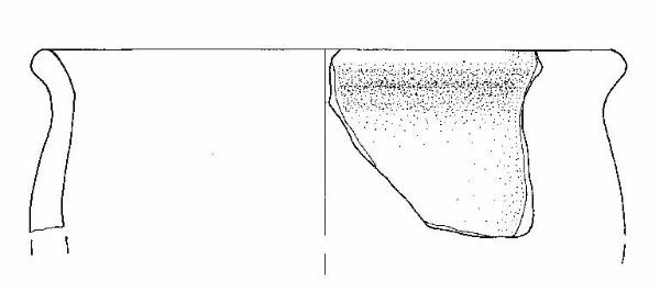 Orlo+ parete di olla\nSi conserva un frammento di orlo svasato con bordo appiattito e parete.\nCorpo ceramico semi grossolano, a superficie esterna con tracce di lisciatura, interna grezza.\nColore nucleo: grigio, esterno e interno: bruno.