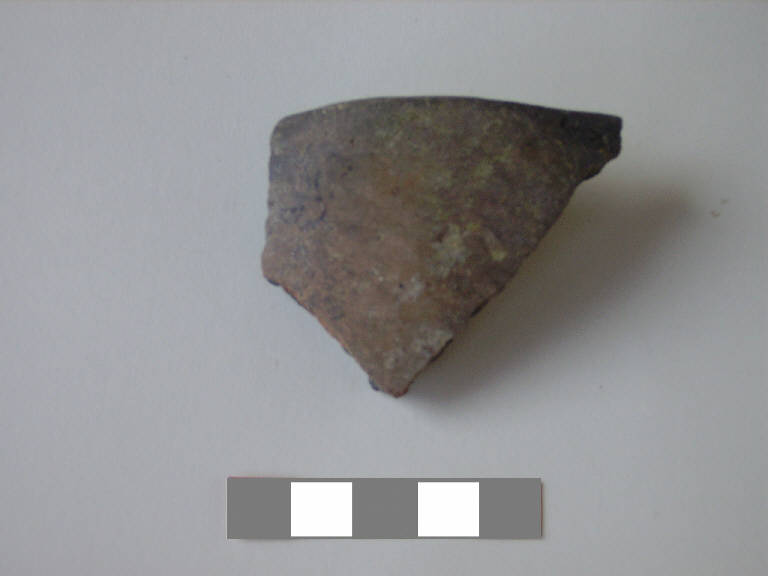 Orlo+ parete di olla\nSi conserva un frammento di orlo indistinto con bordo appiattito e parete.\nCorpo ceramico grossolano, a superficie esterna e interna lisciata sommariamente.\nColore nucleo, esterno, interno: bruno scuro.