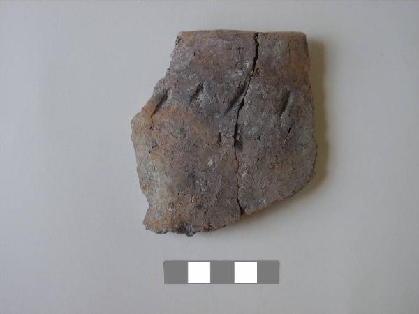 Orlo+ parete di vaso troncoconico\nSi conserva un frammento di orlo distinto con bordo appiattito e parete. Reca una serie di tacche impresse sulla spalla.\nCorpo ceramico grossolano, a superficie esterna e interna grezza.\nColore nucleo: grigio, esterno, interno: bruno.