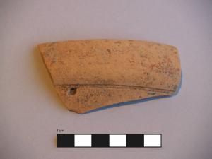 Orlo+parete di mortaio. \nOrlo ingrossato a fascia arrotondata, con una leggera rastrematura all'esterno, labbro verticale, attacco di vasca; una sottile solcatura tra il l'orlo e l'attacco della vasca.\nCorpo ceramico poco compatto, con superficie farinosa, con depurazione buona, assenza di inclusi. Colore nucleo: giallo-rosato; sup. esterna: giallo-rosato, una banda dipinta di colore rosso sull'orlo; sup. interna: giallo-rosato.