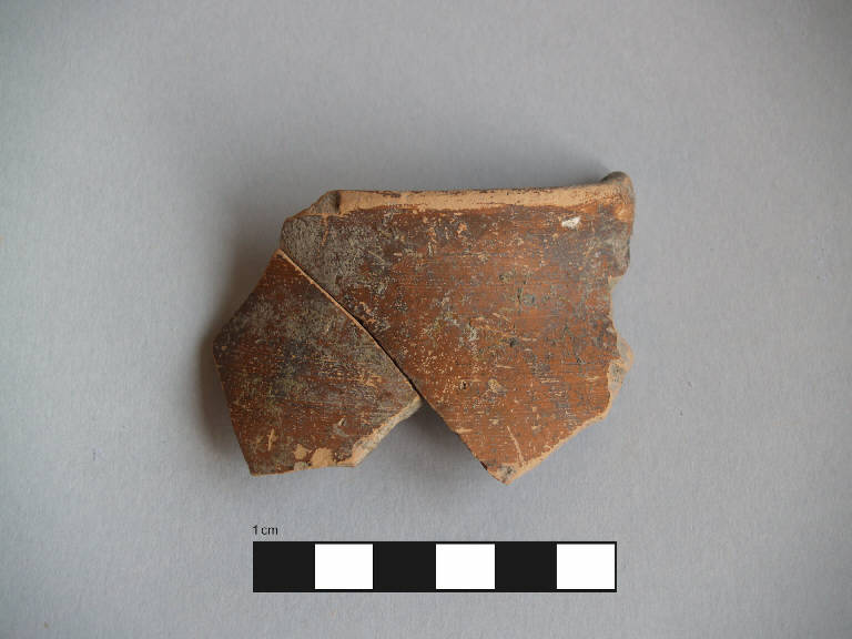 Orlo+parete di brocca.\nOrlo arrotondato con probabile attacco del becco o di un'ansa, labbro estroflesso a profilo curvilineo, spalla arrotondata, corpo ovoide.\nC.c. compatto, con superficie farinosa, con depurazione buona, assenza di inclusi. Colore nucleo: giallo-rosato; sup. esterna: dipinta di bruno; sup. interna: dipinta di bruno.\n2 frammenti combacianti.