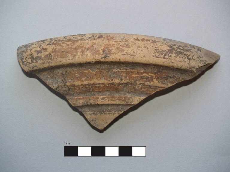 Orlo+parete decorata di mortaio. \nOrlo ingrossato a mandorla, labbro verticale, vasca troncoconica profonda; un cordone orizzontale 2 cm ca. al di sotto dell'orlo; grani minerali sulla superficie interna.\nCorpo ceramico poco compatto, con superficie farinosa, con depurazione buona, assenza di inclusi. Colore nucleo: grigio-beige; sup. esterna: grigio-beige, una banda dipinta di colore bruno nella parte superiore; sup. interna: grigio-beige, una banda dipinta di colore bruno nella parte superiore.