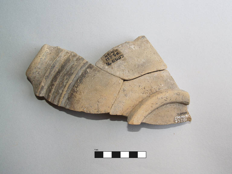 Orlo+parete decorata di mortaio.\nOrlo ingrossato a mandorla, vasca troncoconica mediamente profonda; sull'orlo è impostato un beccuccio versatoio; un cordone orizzontale 2 cm ca. al di sotto dell'orlo; grani minerali sulle superficie interna.\nCorpo ceramico poco compatto, con superficie farinosa, con depurazione buona, assenza di inclusi. Colore nucleo: grigio-beige; sup. esterna: grigio-beige, una banda dipinta di colore rosso-bruno dall'orlo fino a 1 cm ca. al di sotto del cordone; sup. interna: grigio-beige, tracce di una banda dipinta di colore bruno nella parte superiore.\n2 frammenti combacianti