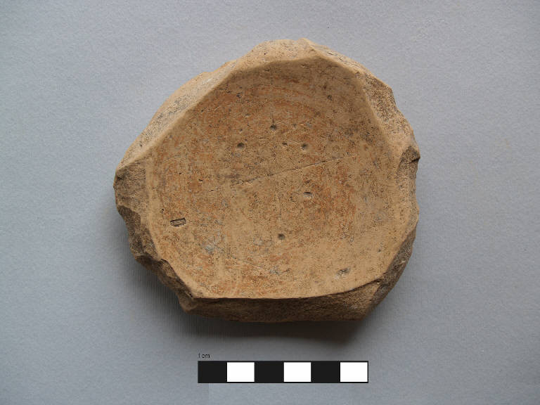 Parete+piede di ciotola.\nPiede ad anello svasato con fondo ombelicato; una sottile solcatura tra l'attacco del piede e il fondo; uu segno a X graffito sul fondo interno.\nCorpo ceramico poco compatto, con superficie farinosa, con depurazione buona, assenza di inclusi. Colore nucleo: beige chiaro; sup. esterna: beige chiaro; sup. interna: beige chiaro, tracce di pittura di colore rosso-arancio.