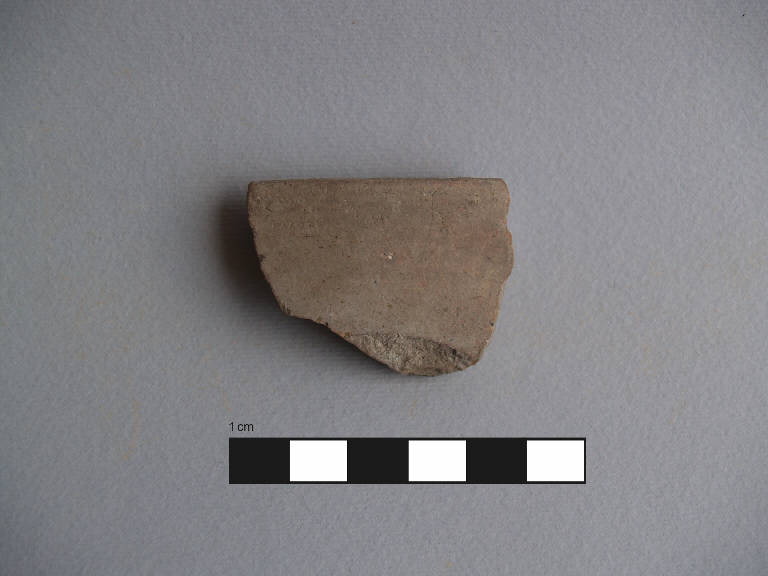 Orlo+parete di ciotola. \nOrlo ingrossato internamente, piatto, obliquo verso l'interno, labbro verticale a profilo curvilineo, attacco di vasca.\nCorpo ceramico compatto, con superficie farinosa, con depurazione buona, con pochi inclusi di colore bianco di piccole dimensioni. Colore nucleo: grigio-rosato; sup. esterna: grigio-rosato, tracce di pittura di colore bruno; sup. interna: grigio-rosato, tracce di pittura di colore bruno.