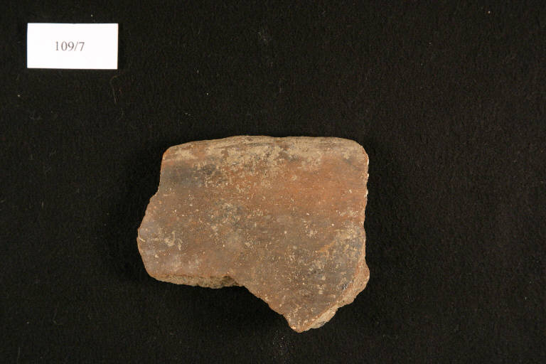 orlo ingrossato e obliquo verso l'interno, labbro indistinto, attaccatura della vasca troncoconica; tacche digitali sull'orlo.