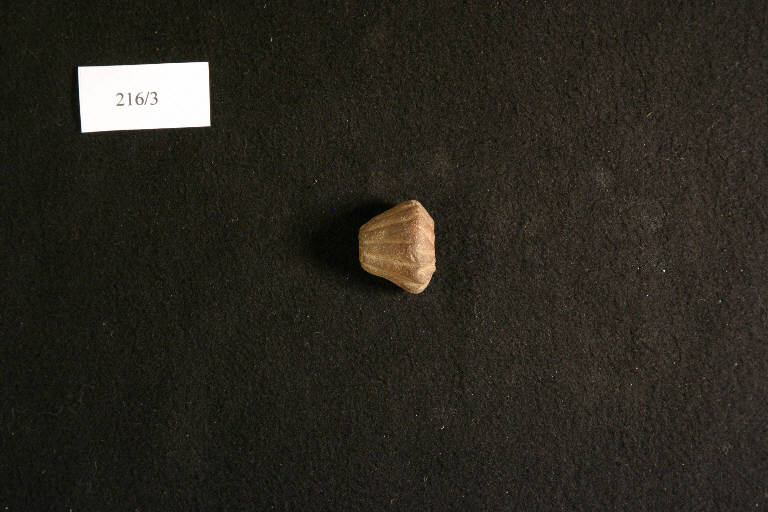 fusaiola biconica; incisioni verticali sulla faccia superiore, legg. oblique su quella inferiore; incisione circolare attorno al foro superiore.