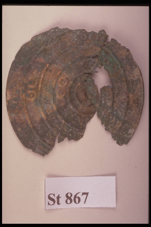 Disco di lamina bronzea con decorazione a sbalzo di cerchi concentrici, file di puntini e occhi di dado
