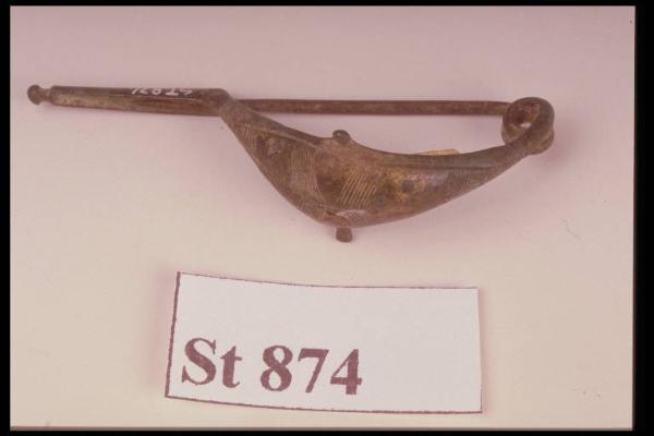 Fibula a navicella romboidale con bottoni laterali, staffa lunga con appendice troncoconica, arco decorato da fasci di trattini obliqui paralleli
