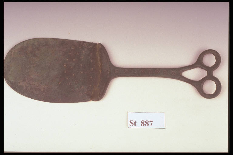 Paletta di forma quasi ovale decorata a incisione da una fascia di cerchi concentrici, motivi a spina di pesce e una fila di denti di lupo. Manico decorato da una fila di cerchi concentrici terminante con due occhielli